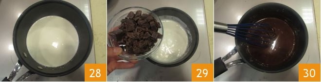 Geben Sie die Sahne in einen Topf und erhitzen Sie sie bis zum Siedepunkt 28; sobald sie zu kochen beginnt, schalten Sie das Feuer aus und fügen die Schokolade hinzu 29. Rühren Sie mit einem Schneebesen, bis die Schokolade vollständig geschmolzen und gut vermischt ist 30.