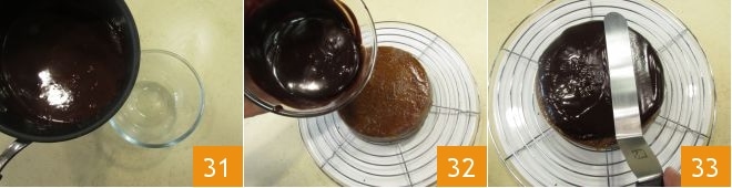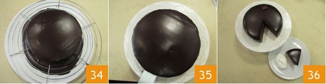 Geben Sie dann die Ganache in eine Schüssel 31 und verwenden Sie sie, um den Kuchen zu glasieren 32, indem Sie sich mit einem Spatel helfen und ihn sanft auf die Oberfläche schlagen, um sowohl die Oberfläche als auch die Ränder zu bedecken und gleichzeitig zu glätten 33. Um glatt und glänzend zu erscheinen, sollte die Ganache eine Temperatur von etwa 40 Grad haben.