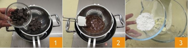 Um die Sachertorte zuzubereiten, geben Sie zunächst die Schokolade in kleinen Stücken in eine Schüssel 1 und schmelzen Sie sie im Wasserbad 2. Wenn Sie möchten, können Sie die Schokolade in der Mikrowelle schmelzen, indem Sie sie einige Sekunden lang laufen lassen und bei jeder Unterbrechung umrühren, damit die Schokolade nicht verbrennt. In der Zwischenzeit geben Sie die weiche Butter und den Puderzucker in die Schüssel einer Küchenmaschine 3