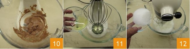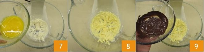 Gießen Sie dann die leicht geschlagenen Eigelbe in zwei Portionen ein 7 und schlagen Sie die Butter weiter auf 8; dies dauert etwa 8-10 Minuten. Wichtig ist, dass die Mischung aus Puderzucker, Eigelb und Butter gut aufgeschlagen ist, damit der Teig beim Backen gut aufgeht. Stellen Sie sicher, dass die geschmolzene Schokolade eine Temperatur zwischen 45 und 55 Grad hat; es ist ratsam, ein Thermometer zu verwenden, um dies zu überprüfen: Wenn sie zu hoch ist, könnte sie die Butter schmelzen, wenn sie zu niedrig ist, könnte sie die Mischung zu sehr festigen. Geben Sie nun die Schokolade in die Butter-Ei-Mischung 9 und rühren Sie weiter