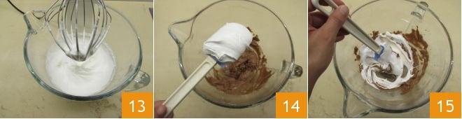 Die Eiweiße sollten nicht zu steif geschlagen werden, sondern kurz vorher 13 stoppen, sonst schlagen sie sich weiter auf, wenn Sie sie in den Teig geben, und der Kuchen könnte beim Backen zusammenfallen. Geben Sie die Eiweiße nun in zwei Portionen zur Schokoladen-Ei-Mischung 14 und rühren Sie mit einem Spatel 15 oder einem Schneebesen.