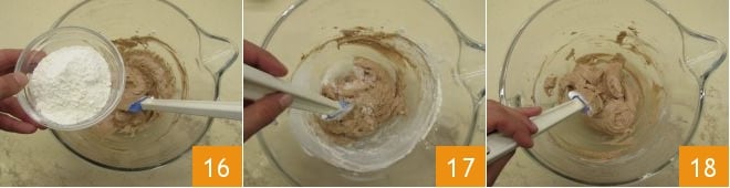 Fügen Sie dann das bereits gesiebte Mehl hinzu 16 und rühren Sie mit einem Spatel von oben nach unten 17, bis eine glatte und gleichmäßige Mischung entsteht 18.