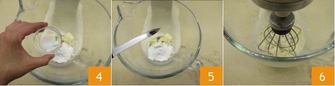 und eine Prise Salz 4. Fügen Sie auch die Samen der Vanilleschote hinzu 5 und beginnen Sie, die Mischung mit dem Schneebesen zu bearbeiten 6, bis sie cremig ist.