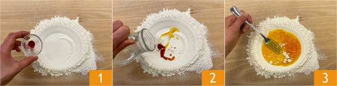 Um die Safran-Gyoza zuzubereiten, geben Sie zuerst das Mehl auf ein Nudelbrett und formen Sie eine Mulde. Geben Sie den Safran 1, das Wasser 2 und eine Prise Salz hinein. Rühren Sie mit einer Gabel 3 um.