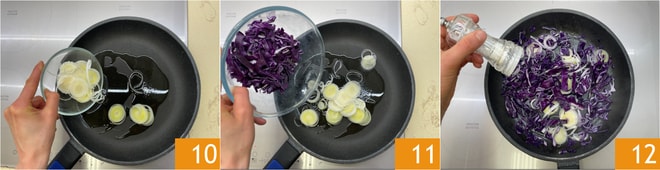 Geben Sie in eine Pfanne etwas Sesamöl, fügen Sie den Lauch 10, den Weißkohl 11 hinzu, salzen und pfeffern Sie 12. Braten Sie alles einige Minuten an.