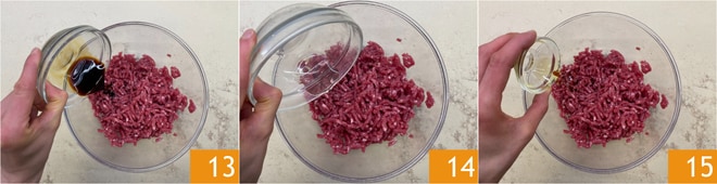 Geben Sie das Hackfleisch in eine Schüssel, fügen Sie die Sojasauce 13, den Sake 14 und das Sesamöl 15 hinzu.