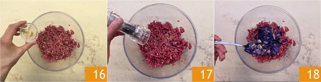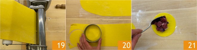 Rollen Sie den Teig aus 19, mit einem Nudelholz oder einer Nudelmaschine, bis Sie einen dünnen Teig von etwa 2-3 mm Dicke erhalten. Stechen Sie mit einem Ausstecher Kreise aus 20. Geben Sie in die Mitte jedes Kreises einen Löffel Füllung 21.