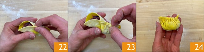 Falten Sie die Kreise zur Hälfte 22 und versiegeln Sie die Ränder gut, indem Sie die typischen Falten dieses Formats erstellen 23 24.