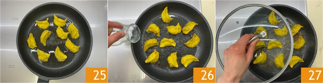Erhitzen Sie in einer Pfanne das Sesamöl, legen Sie die Gyoza hinein 25 und braten Sie sie einige Minuten, bis die Unterseite goldbraun wird. Fügen Sie das Wasser hinzu 26, decken Sie mit einem Deckel ab 27.