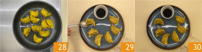Kochen Sie bei mittlerer Hitze etwa 5–6 Minuten, bis das Wasser vollständig verdunstet ist 28. Servieren Sie die Safran-Gyoza heiß auf einem Teller 29 mit Sojasauce 30.