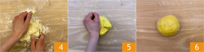 Kneten Sie 4, bis Sie einen glatten und gleichmäßigen Teigball 5 erhalten. Wickeln Sie ihn in Frischhaltefolie und lassen Sie ihn 30 Minuten ruhen 6.