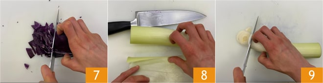 Bereiten Sie in der Zwischenzeit die Füllung vor. Schneiden Sie den Weißkohl fein 7, entfernen Sie die härteren Teile des Lauchs 8 und schneiden Sie ihn in Ringe 9.