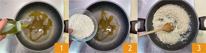 Um den Safranreis aus dem Ofen mit Speck und Brie zuzubereiten, bringen Sie zuerst einen Topf mit Wasser zum Kochen, das Sie für das Risotto benötigen. Erhitzen Sie das Öl in einer Pfanne 1, dann geben Sie den Reis hinein 2 und rösten ihn für ein paar Minuten unter häufigem Rühren, bis er sich warm anfühlt 3.
