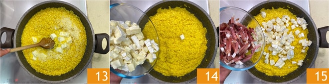 Lassen Sie es eine Minute ruhen, bevor Sie alles gut vermengen 13. Sollte es zu trocken sein, können Sie noch etwas Wasser hinzufügen. Zu diesem Zeitpunkt den Taleggio 14 und den Speck 15 hinzufügen.