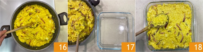 Gut mischen 16, dann das Risotto in eine 24x24 cm große Auflaufform geben 17 und die Oberfläche glattstreichen 18.
