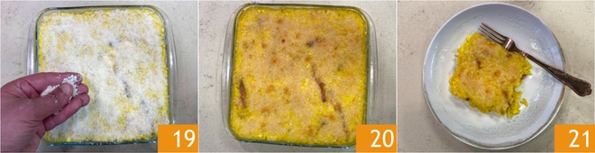 Bestreuen Sie die Oberfläche mit reichlich geriebenem Käse 19 und backen Sie in einem vorgeheizten, statischen Ofen bei 230°C für etwa 20 Minuten. Wenn die Kruste knusprig und goldgelb wird, nehmen Sie den Auflauf aus dem Ofen 20 und lassen ihn ein paar Minuten ruhen. Ihr Safranrisotto aus dem Ofen mit Speck und Brie ist bereit zum Servieren 21!