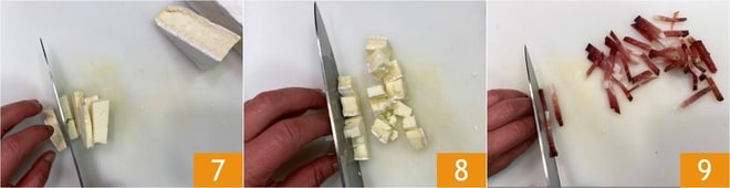 In der Zwischenzeit schneiden Sie den Taleggio zuerst in Scheiben 7 und dann in Würfel 8. Schneiden Sie den Speck in Streifen 9.