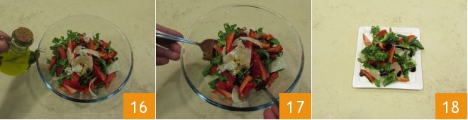 und einem Esslöffel Öl 16, dann mischen Sie alles vorsichtig 17: Ihr Salat mit Erdbeeren und Balsamico ist bereit, serviert zu werden 18!