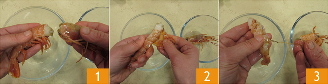Um den Salat mit Garnelen und Avocado zuzubereiten, widmen Sie sich zuerst der Wie man Garnelen reinigt: Entfernen Sie den Kopf 1, dann den Panzer 2 und den Darm, der sich auf dem Rücken der Krustentiere befindet 3.