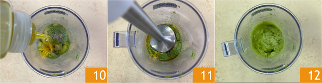 Fügen Sie das Öl hinzu 10 und pürieren Sie mit einem Stabmixer 11, bis eine glatte und homogene Creme entsteht 12.