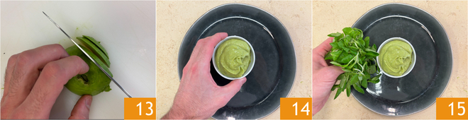 Jetzt reinigen Sie die zweite Avocado, entfernen den Kern und schneiden das Fruchtfleisch in Scheiben 13. Stellen Sie in die Mitte eines Serviertellers eine Schale mit der Avocadocreme 14, dann verteilen Sie den Feldsalat rundherum 15.