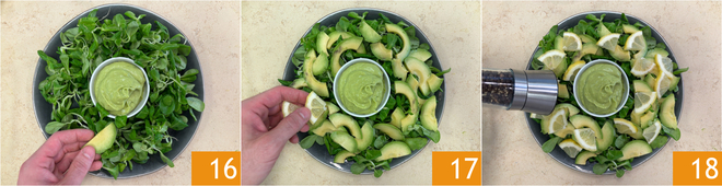 Legen Sie die Avocadoscheiben 16 und die Zitronenscheiben 17 auf den Feldsalat. Würzen Sie mit Salz und Pfeffer 18.