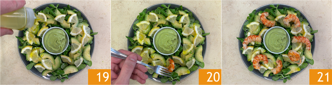 Vervollständigen Sie mit einem Schuss Öl 19 und fügen Sie schließlich die Garnelen hinzu 20. Ihr Salat mit Garnelen und Avocado ist bereit zum Servieren 21!