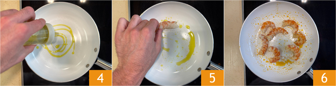 Erhitzen Sie etwas Öl in einer Pfanne 4, dann legen Sie die Garnelen hinein 5 und braten Sie sie bei mittlerer Hitze auf beiden Seiten an, insgesamt 5 Minuten 6. Beiseite stellen.