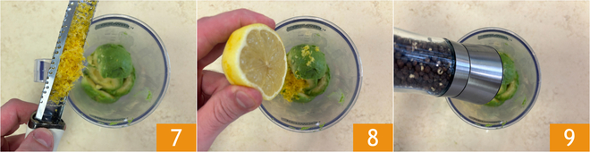 Machen Sie weiter mit der Avocadocreme: Entnehmen Sie das Fruchtfleisch der Avocado und geben Sie es in ein Gefäß zusammen mit der Schale 7 und dem Zitronensaft 8, dann salzen und pfeffern 9.