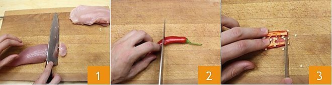 Um die Salatbecher mit Putenbrustsalat zuzubereiten, legen Sie die Putenbrust auf ein Schneidebrett und schneiden Sie sie in unregelmäßige Stückchen 1. Schneiden Sie dann eine frische Chilischote in zwei Hälften 2, teilen Sie sie nochmals in zwei und entfernen Sie die Samen 3.