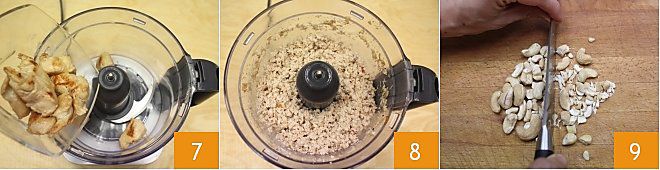 Wenn die Putenstückchen gar sind, geben Sie sie in einen Mixer 7, schalten Sie ihn für einige Sekunden ein, bis das Fleisch gut zerkleinert ist 8, und geben Sie die Mischung dann in eine große Schüssel. Sie können diesen Vorgang auch mit einem Messer durchführen, wenn Sie keinen Mixer haben. Legen Sie nun die Cashewnüsse auf ein Schneidebrett und hacken Sie sie grob 9.