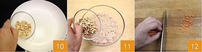 Rösten Sie die gehackten Cashewnüsse in einer antihaftbeschichteten Pfanne und rösten Sie sie einige Minuten, bis sie knusprig und dunkler sind 10. Fügen Sie dann die gerösteten Cashewnüsse zu den gehackten Putenstückchen hinzu 11. Nehmen Sie eine Karotte, schälen Sie sie und teilen Sie sie in zwei Hälften. Schneiden Sie sie dann in kleine Würfelchen 12.