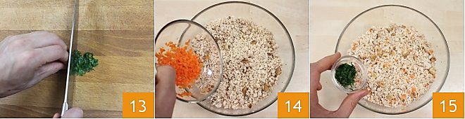 Waschen Sie auch die Petersilie unter fließendem Wasser und hacken Sie sie fein auf einem Schneidebrett 13. Fügen Sie nun die Karottenwürfel 14 und die gehackte Petersilie zur Mischung hinzu 15.