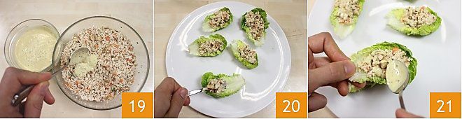 Nachdem Sie die Senfsauce zubereitet haben, fügen Sie die Hälfte davon zur Mischung aus Pute, Karotten und Petersilie hinzu 19 und vermengen Sie alles, bis eine ziemlich feste Konsistenz erzielt wird. Waschen Sie nun die Baby-Salatblätter gründlich und lösen Sie die Blätter, wobei Sie die knusprigsten und gebogensten auf einem Servierplatten anrichten. Füllen Sie sie dann mit der Mischung 20. Ihre Salatbecher mit Putenbrustsalat sind bereit zum Servieren. Verfeinern Sie sie mit zusätzlicher Senfsauce, um sie noch köstlicher zu machen 21!