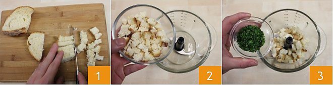 Um den knusprigen Lachs auf Schiacciate zuzubereiten, kümmern Sie sich zunächst um das Brot, indem Sie die Scheiben in kleine Würfel schneiden 1. Geben Sie das so zerkleinerte Brot in einen Mixer 2, fügen Sie dann die gehackte Petersilie hinzu 3
