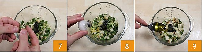 und die Majoranblätter 7. Dann mit Salz und Pfeffer abschmecken 8 und auch die zwei Esslöffel Olivenöl extra vergine hinzufügen 9.