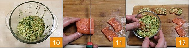 Hacken Sie die Mischung grob 10, also nicht zu fein, und geben Sie sie in eine Schüssel. Jetzt kümmern Sie sich um den Lachs, trocknen Sie die Filets gut ab und schneiden Sie 12 Scheiben, die die gleiche Größe wie die Schiacciate haben, auf die sie gelegt werden 11. Wenden Sie die so erhaltenen Lachsfilets in der Panade 12, sodass sie auf allen Seiten gut haftet.