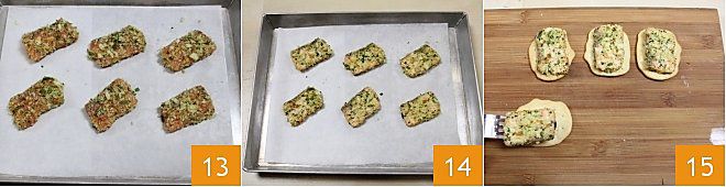 Legen Sie den so panierten Lachs auf ein mit Backpapier ausgelegtes Blech 13. Bei 190° für zehn Minuten in einem vorgeheizten statischen Ofen backen (im Umluftofen bei 160° für 10 Minuten). Sobald der Lachs gar und gut gebräunt ist 14, nehmen Sie ihn aus dem Ofen, lassen ihn abkühlen und legen dann jedes Filet auf eine Schiacciata 15, und platzieren Sie auf jedes Filet einige Blätter Kräuter. Und servieren Sie Ihren knusprigen Lachs auf Schiacciate!