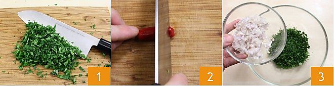 Um den gegrillten Lachs mit Petersiliensoße zuzubereiten, beginnen Sie mit der Petersiliensoße, die Sie auch einige Stunden im Voraus zubereiten können, wenn Sie möchten. Hacken Sie fein mit dem Messer (oder zerkleinern Sie die Petersilie, wenn Sie möchten, im Mixer) die Petersilie 1 und die Schalotte, schneiden Sie die frische Chili in kleine Stücke 2. Geben Sie die gehackte Petersilie und die gehackte Schalotte in eine Schüssel