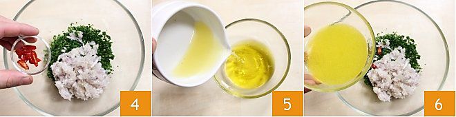 und die in Stücke geschnittene Chili. Lassen Sie die gemischte Mischung beiseite. Kümmern Sie sich jetzt um die Soße für das Dressing: Gießen Sie in eine kleine Schüssel das Öl, den Zitronensaft 5 und zwei Esslöffel Apfelessig. Emulgieren Sie die Soße gut und mischen Sie sie mit der zuvor zubereiteten Mischung 6,