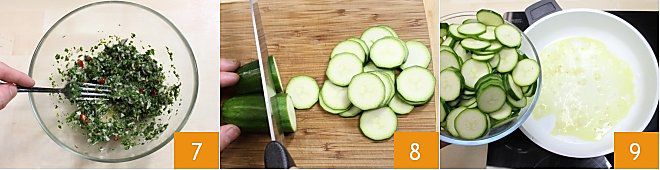 mischen Sie gut, damit die Mischung das Dressing aufnimmt 7, passen Sie Salz und Pfeffer an. Lassen Sie die Soße beiseite und kümmern Sie sich um die Zucchini-Beilage: Waschen und schneiden Sie die Zucchini in Scheiben 8. Geben Sie den gehackten Knoblauch (oder wenn Sie möchten, können Sie ihn ganz lassen und dann entfernen, nachdem er das Öl gewürzt hat) und vier Esslöffel Öl in eine große Pfanne, lassen Sie es anbraten und fügen Sie die Zucchini hinzu, salzen, pfeffern