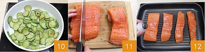 (Sie können das Verfahren in der Rezeptanleitung der Gebratene Zucchini nachlesen) und bei starker Hitze kochen, indem Sie die Pfanne mit einem Deckel abdecken, bis die Zucchini gekocht sind 10. Zum Schluss bereiten Sie den Lachs vor: Nehmen Sie das gereinigte Lachsfilet und schneiden Sie es in 4 Stücke von etwa 200 g jedes 11. (Alternativ können Sie in der Fischhandlung 4 bereits geschnittene Stücke kaufen). Erhitzen Sie eine Gusseisenplatte, sobald sie gut heiß ist, legen Sie die Stücke darauf, salzen 12,