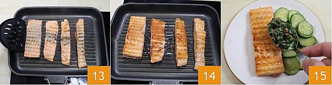 pfeffern und für etwa 3-4 Minuten pro Seite kochen 13. Die Stücke sind fertig, wenn die Oberfläche gut gebräunt ist 14. Jetzt können Sie anrichten 15: Beträufeln Sie den Lachs mit der zuvor zubereiteten Petersiliensoße und fügen Sie die gebratenen Zucchini hinzu. Servieren Sie den gegrillten Lachs mit Petersiliensoße heiß.