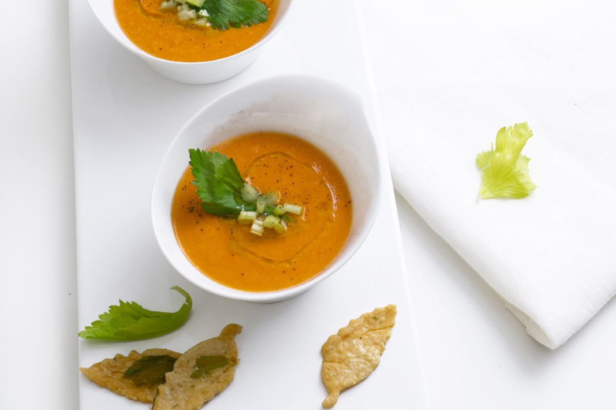 Der Salmorejo mit Sellerie-Crackern ist eine leckere Vorspeise auf andalusische Art!