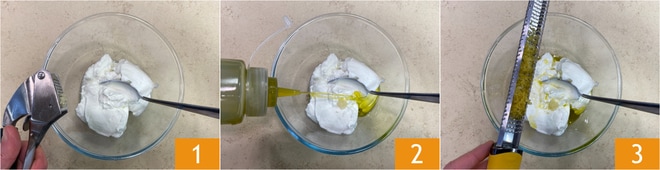 Um die griechische Joghurtsoße zuzubereiten, geben Sie zuerst den griechischen Joghurt in eine Schüssel, fügen Sie dann die zerdrückte Knoblauchzehe hinzu 1. Gießen Sie das Öl hinzu 2 und fügen Sie die Zitronenschale hinzu 3.