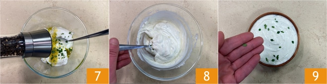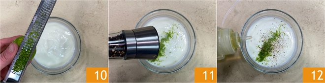 Um die weiße Joghurtsoße zuzubereiten, geben Sie den weißen Joghurt in eine Schüssel und fügen Sie die Limettenschale hinzu 10, eine Prise Pfeffer 11 und das Öl 12.
