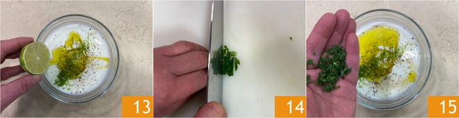Fügen Sie den Saft einer halben Limette hinzu 13. Hacken Sie die Minze fein 14 und geben Sie sie in die Schüssel 15.