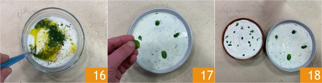 Rühren Sie gründlich um 16 und vervollständigen Sie mit ein paar weiteren Minzblättern 17. Die beiden Varianten der Joghurtsoße sind bereit zur Verwendung 18!