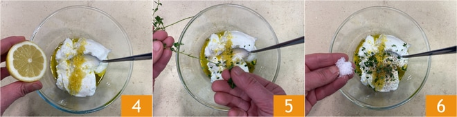Fügen Sie auch ein paar Tropfen Zitronensaft hinzu 4 und einige Blättchen Zitronenthymian 5. Würzen Sie mit Salz 6.
