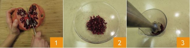 Um die herzhaften Blätterteigschnecken mit Granatapfel zuzubereiten, kümmern Sie sich zuerst um den Granatapfel: Schneiden Sie ihn halb 1, entkernen Sie ihn 2 und pürieren Sie die Kerne mit einem Stabmixer 3.